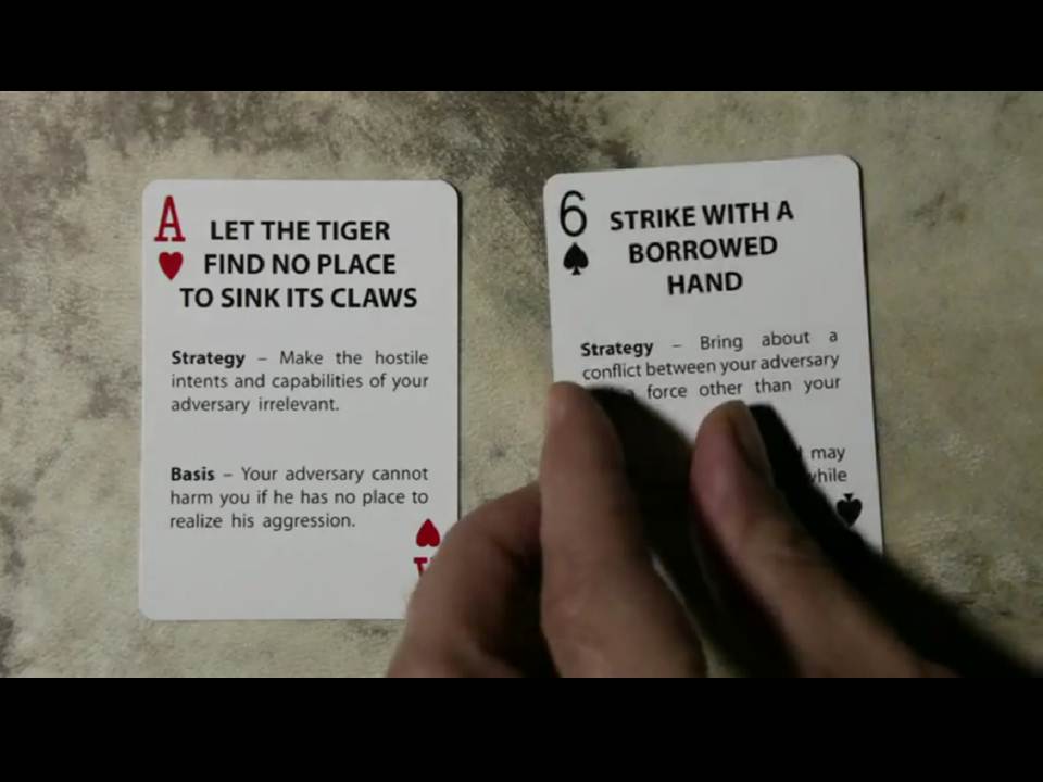 Shuffle the Art of War: Sun Tzu Strategy Card Deck, and draw five cards each.  Decide who goes first.  Draw another card from the deck and place the card face up on the table.  In less than 10 seconds, have the first player select a counterstrategy from his card deck, place that card face up on the table, and draw a replacement card from the deck.  In less than 10 seconds, have the second player select a counter strategy to the first player’s card, place that card face up on the table, and draw a replacement card from the deck.  Continue this sparing cycle until you go through the entire deck.  (If you have a chess clock or two stop watches, you can use them to keep up the pace and make the sparing more competitive.)